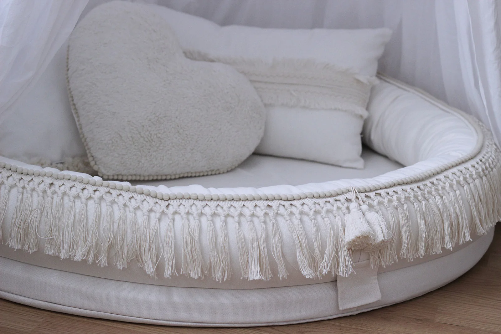 Prachtig junior BOHO speelnestje van Cotton & Sweets. Ideaal om onder een klamboe te leggen of om een gezellig speelhoekje mee te creëren. Dit speelnestje is super zacht dus ook ideaal voor kleintjes die nog niet zo goed kunnen zitten. Vallen kan in overvloed. De afwerking van dit nestje werd volledig met de hand gedaan.