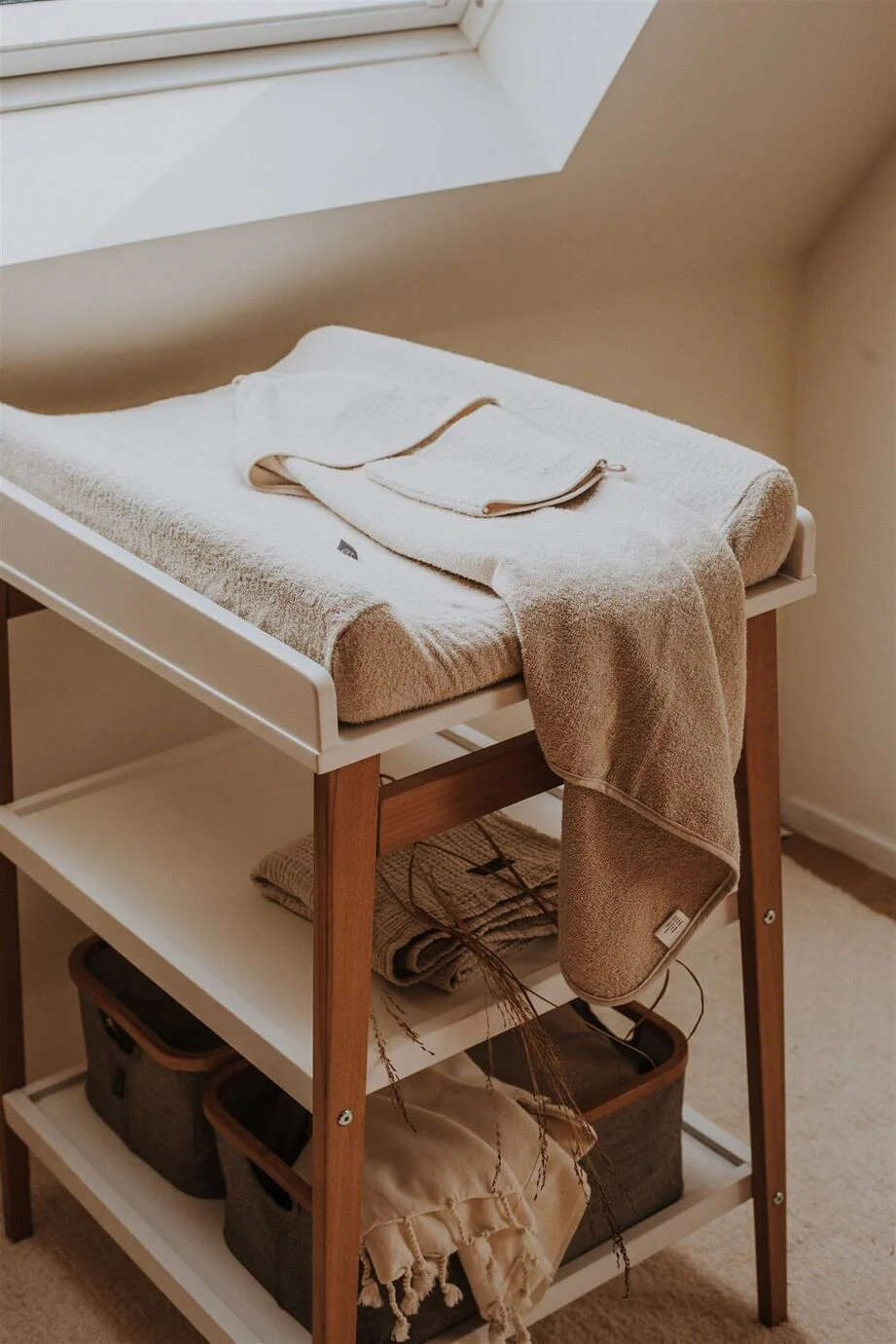 De opbergruimte onderaan de verschoningstafel kan je gebruiken om de luiers, toilettasje, ... in op te bergen. Je gebruikt deze extra opbergruimte optimaal door leuke opbergmandjes te gebruiken. Zo heb je altijd alles snel bij de hand als je de luier van je kindje aan het verschonen bent!